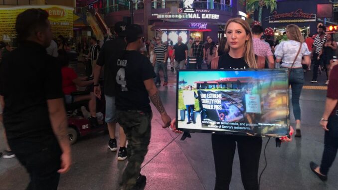 Dane: I mean, it’s disheartening to say the least. This was during a protest that we held outside of a Denny’s Franchise Association conference, and these franchisees have a lot of sway. About 97 percent of Denny’s restaurants are owned by franchisees, and some of these franchisees are on the Supply Chain committee, where purchasing decisions are made for the entire company. So instead of Denny’s franchisees taking this opportunity to address the pressing issue of animal abuse in their supply chain, we were met with glares and this dismissive gesture. So, it was, you know, really unfortunate to see. It’s not only a slap in the face to the animals, but also for Denny’s stakeholders and the loyal customers who have been calling for this change.