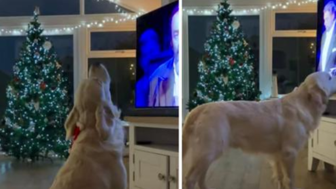 In the video below, the Three Tenors are performing their operatic rendition of White Christmas on the television when the jolly Golden Retriever takes notice and pulls up for a front row seat! But that’s not all — he decides to add his own flavor to the version.