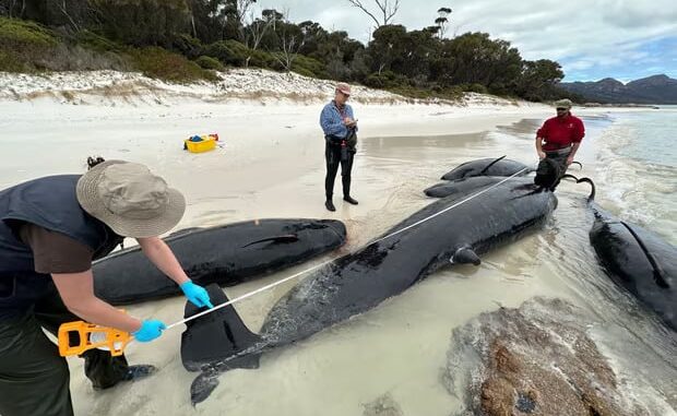 This article by Rafqa Touma was first published by The Guardian on 30 November 2023. Lead Image: Marine Conservation Program and Tasmania Parks and Wildlife Service staff measure a dead pilot whale on Bryans beach. Photograph: NRE Tas.